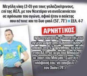 -Αντικειμενική, ακριβοδίκαιη, μοίρασε το καρπούζι στην μέση κτλ. Μερικά επίθετα που αρμόζουν στην περίπτωση των σχολιαστών του παιχνιδιού αποελ-ΑΕΛ από την ltv. Ήταν όπως τον διαιτητή ένα πράμα έπαιζε 80-20% τις 2 ομάδες! ΑΛΛΑ το βραβείο “Χρυσή Αυγή” πάει στον σχολιαστή που στην φάση της κόκκινης κάρτας υπήρχε σύγχυση σε ποιό να θα δινόταν η κάρτα και ήταν κοντά οι Ουόν και Ντόσσα Τζούνιορ (εν οι ίδιοι αφού φτύμα γλύμμα) άθελα του η μη είπε το θεικό “είναι και οι δύο ποδοσφαιριστές του ίδιου χρώματος και δεν τους ξεχωρίζει ο διαιτητής”. Νo comment!