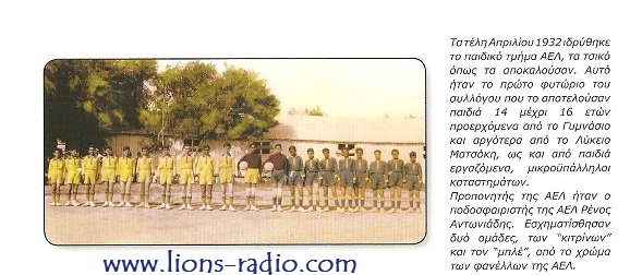 Επειδή το www.lions-radio.com δε θα επιτρέψει σε κανένα να προπαγανδίζει και να ψεύδεται για ότι αφορά την ΑΕΛ και πόσο μάλλον τη σεβαστή της ιστορία, θα σας παρουσιάσει φωτογραφία ντοκουμέντο όπου ομάδα της ΑΕΛ το 1932 φοράει το κίτρινο και το μπλε.