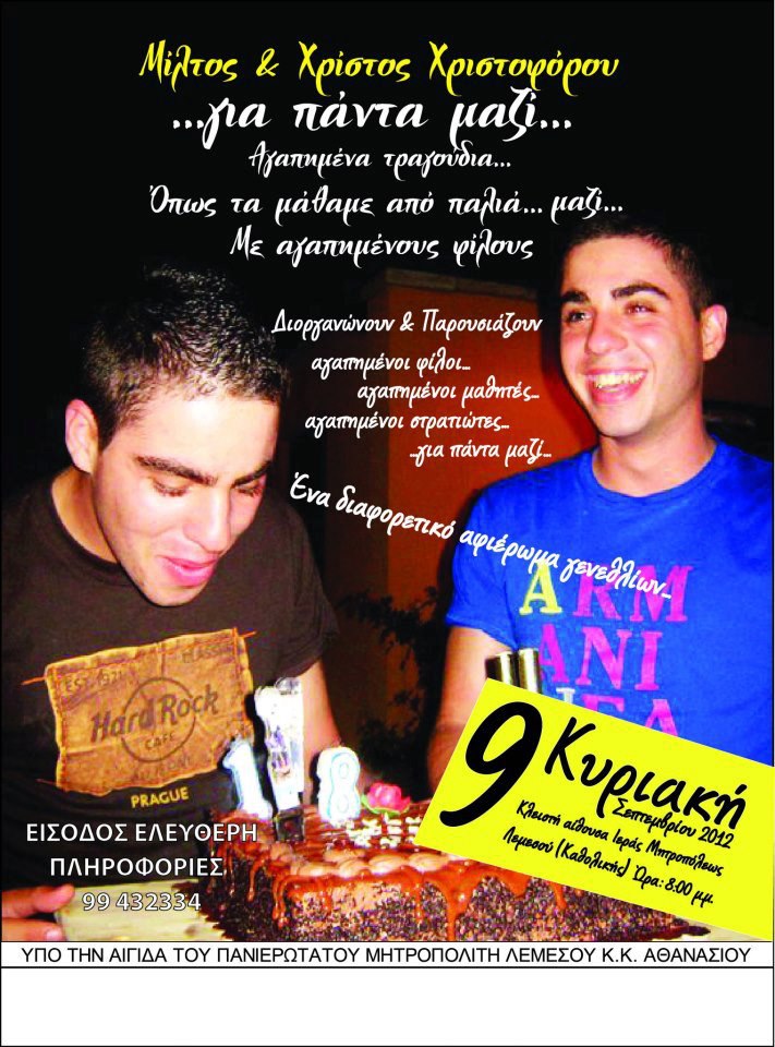 Υπο την αιγίδα του Πανιερώτατου Μητροπολίτη Λεμεσού κ.κ Αθανάσιου αγαπημένοι φίλοι , αγαπημένοι στρατιώτες , αγαπημένοι μαθητές διοργανώνουν και παρουσιάζουν ένα διαφορετικό αφιέρωμα γενεθλίων.