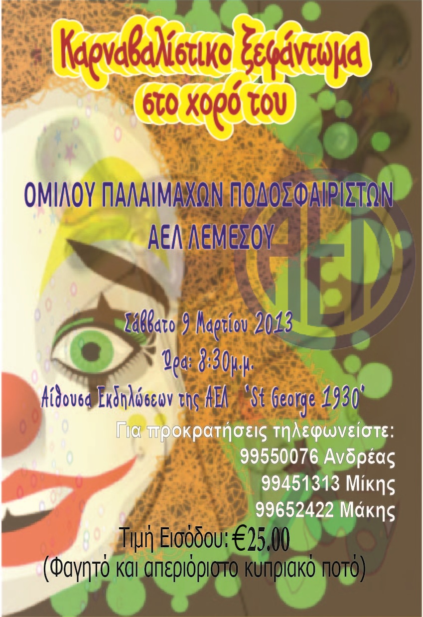 Καρναβαλίστικο χορό διοργανώνει ο Όμιλος παλαιμάχων ποδοσφαιριστών της ΑΕΛ μας και σας προσκαλεί να ξεφαντώσετε σε ΑΕΛίστικους ρυθμούς με τα ιερά τέρατα που αγωνίστηκαν στο παρελθόν με την φανέλα της αγαπημένης μας ομάδας. Αξίζει να αναφέρουμε ότι μέρος των καθαρών εσόδων θα δοθεί σαν στήριξη στο τμήμα φούτσαλ της ΑΕΛ μας. Όπως θα δείτε και στην αφίσα πιο κάτω, ο χορός θα πραγματοποιηθεί το Σάββατο 9 Μαρτίου η ώρα 20:30 στην αίθουσα εκδηλώσεων  του σωματείου μας ‘St George 1930’. Η είσοδος θα είναι 25 ευρώ με απεριόριστο ποτό και φαγητό.