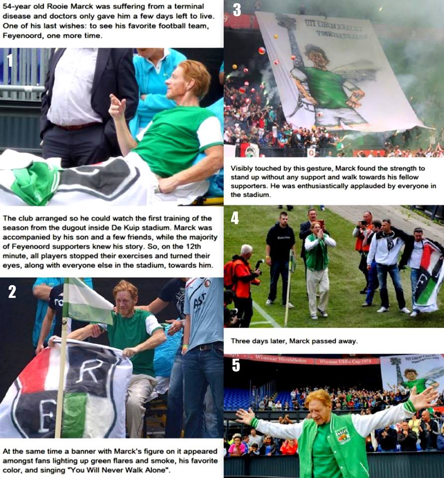 Ο Rooie Marck έπασχε από μια θανατηφόρα ασθένεια. Οι γιατροί του είχαν δώσει ελάχιστες εβδομάδες ζωής και η τελευταία του επιθυμία ήταν να βρεθεί στο γήπεδο της ομάδας για μια τελευταία φορά, ότι ακριβώς είχε ζητήσει κι ένας άλλος οπαδός της Φέγενορντ, ο Ντιέι φαν Σουιλέκομ, πριν σχεδόν δυο χρόνια.