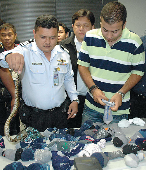 Oι τελωνειακοί υπάλληλοι του αεροδρομίου της Ταϊλάνδης πληροφορήθηκαν πως ο 23χρονος Γκαχρεμάνι Άρας πιθανότατα είχε παράνομα προϊόντα στις βαλίτσες του. Όταν οι υπεύθυνοι έψαξαν τις αποσκευές του, βρήκαν ζωντανά φίδια μέσα σε 36 διαφορετικές κάλτσες. Στον Άρας ανακοινώθηκε η κατακράτησή του στις 13:30, λίγο πριν επιβιβαστεί σε πτήση προς το Ιράν.